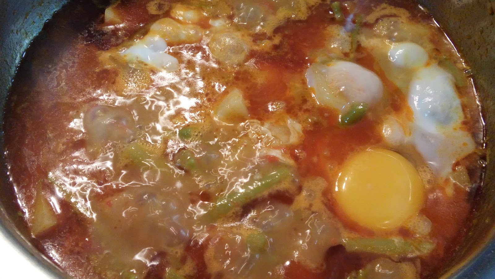Cuando estén tiernas las patatas con espárragos, agregamos los huevos con cuidado para que no se rompan, dejamos la cacerola abierta sin tapar para que los huevos no se pongan duros